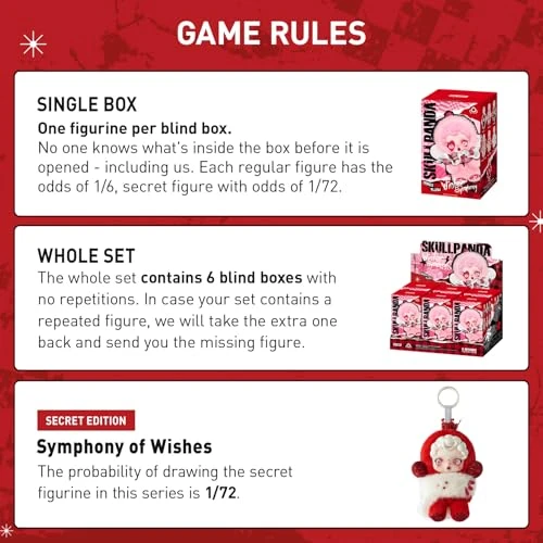 • Random Design: Blind boxes are fully random and we cannot accept requests for specific items. There chances of getting the secret edition are usually 1/72. When purchasing the whole set, there will be no duplicates figures.