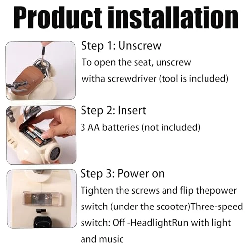 - 【Easy Steps】The battery for this doll scooter is under the seat. Use the attached to remove the screws behind the seat, put in three standard batteries, and then use the screwdriver to screw the screws back on. Press the button under the scooter to turn on the power and start. PLEASE NOTE that batteries are not included.