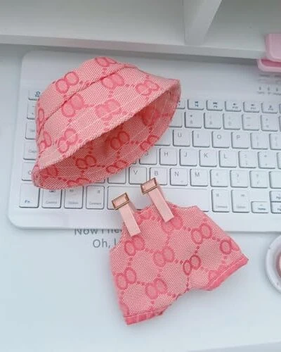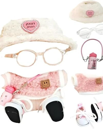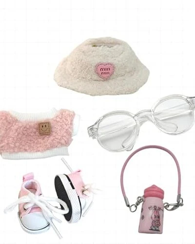 Clothes For Labub, 5-Piece 17cm Clothes For Labub Set With Accessories – Includes Light Pink Velvet Heart Hat, Mini Camera, Glasses & Canvas Shoes (Doll Not Included)(A)